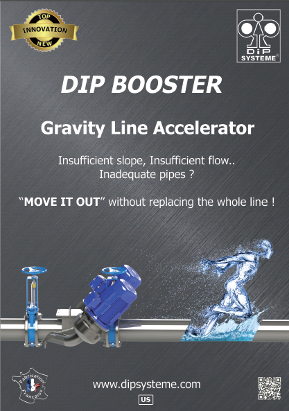 The DIP BOOSTER circulators by Side Industrie are derived from the high range of wastewater circulators DIP Systeme®, and are also made of «boiler-plated» stainless steel. They are composed of a shared hydraulic body that fits the pipe size, allowing the gravity flow to go through it. Includes a «by-pass» valve, a level sensor upstream and 2 variable speed hydraulic drives connected in parallel using VFD’s.