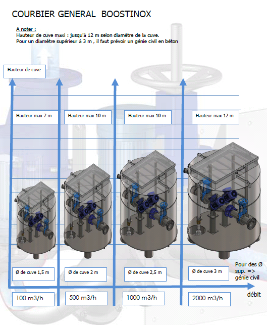 Montée en charge progressive : Le débit gravitaire remplit la conduite et les corps du DIP-BOOSTER. Si le niveau de démarrage du 1er groupe est atteint, il démarre progressivement et accélère le flux, le clapet interne se ferme. Le 2ème groupe démarre si le niveau de charge monte encore. L’arrêt survient quand le débit amont diminue jusqu’à reprendre son écoulement normal.